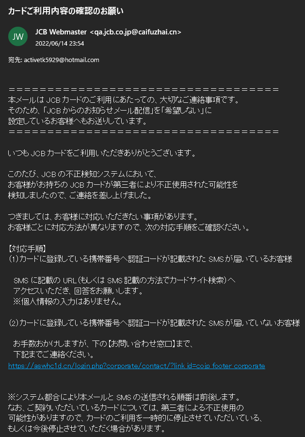 一見するとJCB公式から送付されているように見えますが、ドメインのTLDを見ると「.cn」(中国に割り当て)となっています。