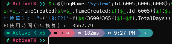 $h=@{LogName='System';Id=6005,6006,6008};$s=0;$t=$f=$l=$null;Get-WinEvent -FilterHa $h -Oldest|%{if(!$f){$f=$_.TimeCreated}$l=$_.TimeCreated;if($_.Id-6005){if($t){$s+=($l-$t).TotalSeconds;$t=$null}}else{$t=$l}};"PC使用時間(1年換算) : "+('{0:F2}'-f($s/3600*365/($l-$f).TotalDays))